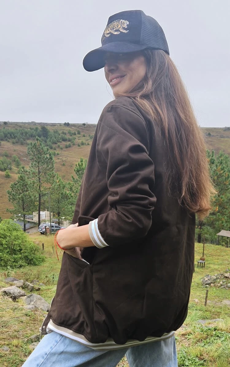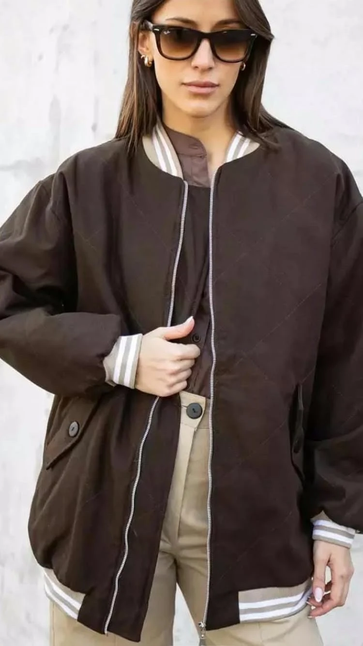 Bomber chocolate con puños y cuello combinado. Talle unico.