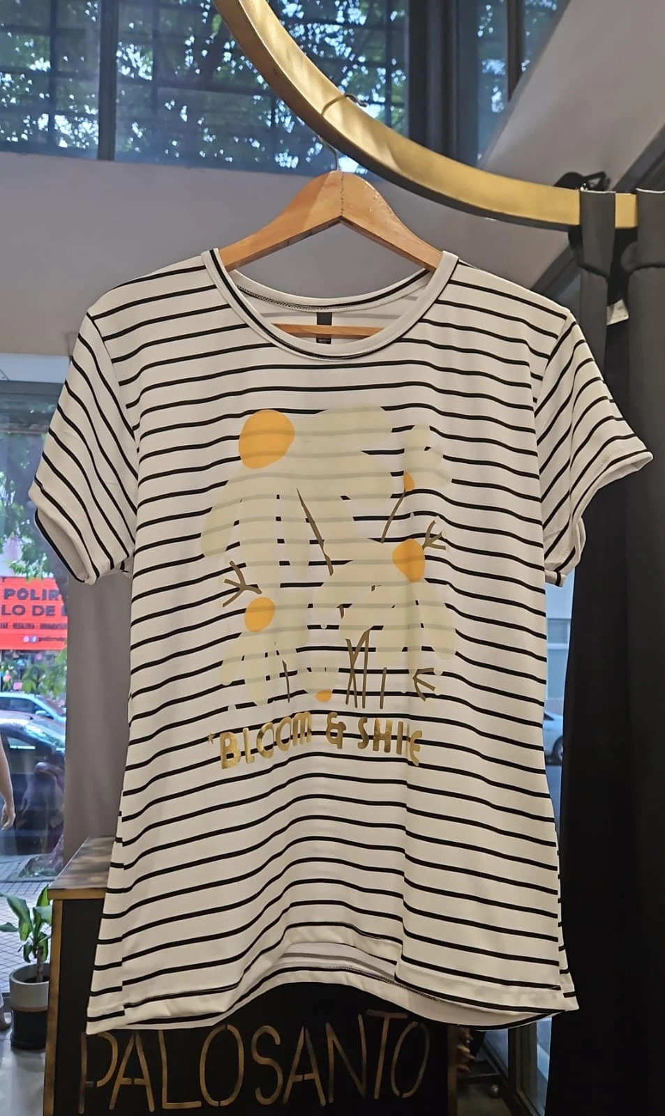 Remera rayada confeccionada en modal soft premium con estampa con detalles dorados. Talle unico.