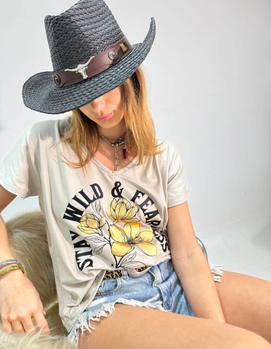 Remera escote V talle unico, confeccionada en modal soft con estampa foil oro.