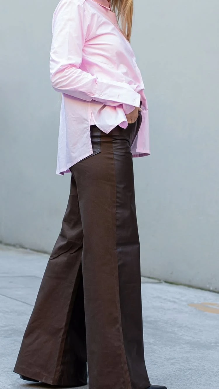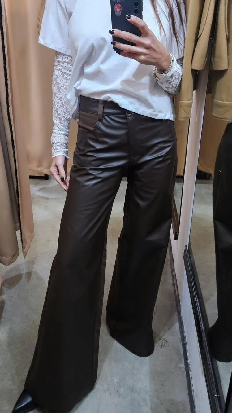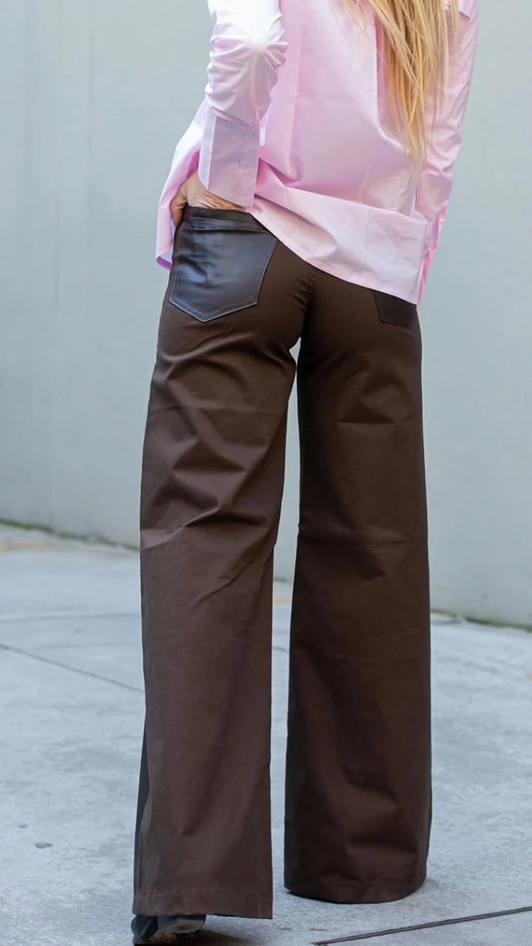 Palazzo color chocolate combinado en sarga de algodon y bengalina engomada.