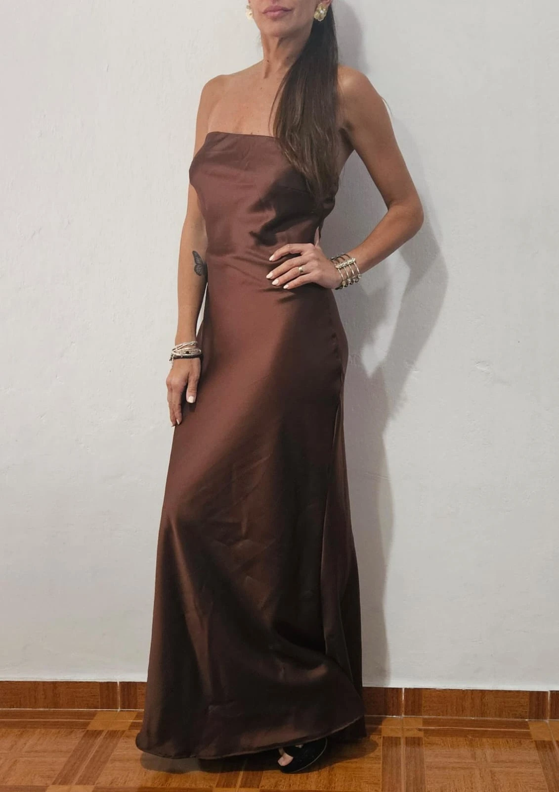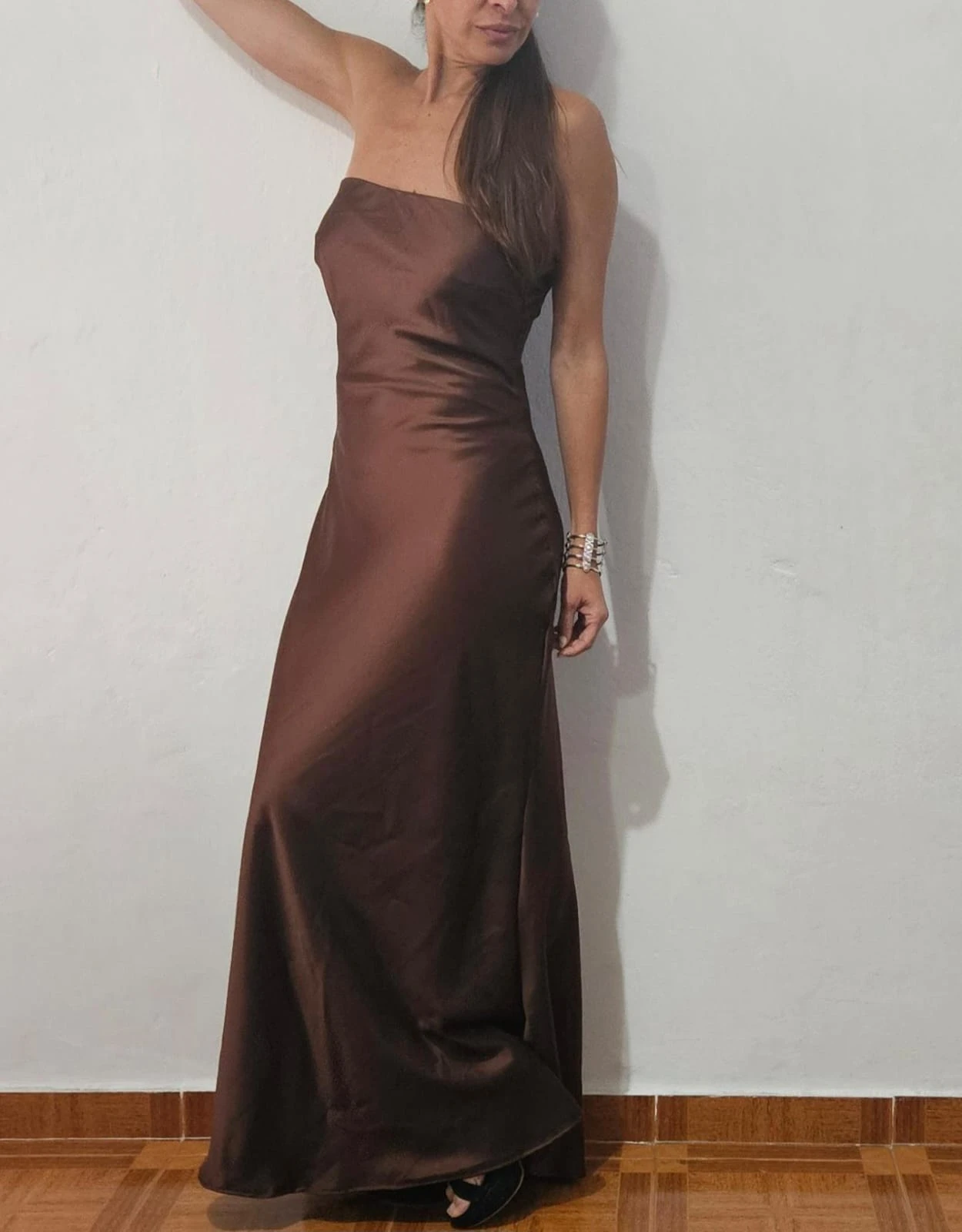 Vestido largo strapless confeccionado en saten. Color: chocolate.