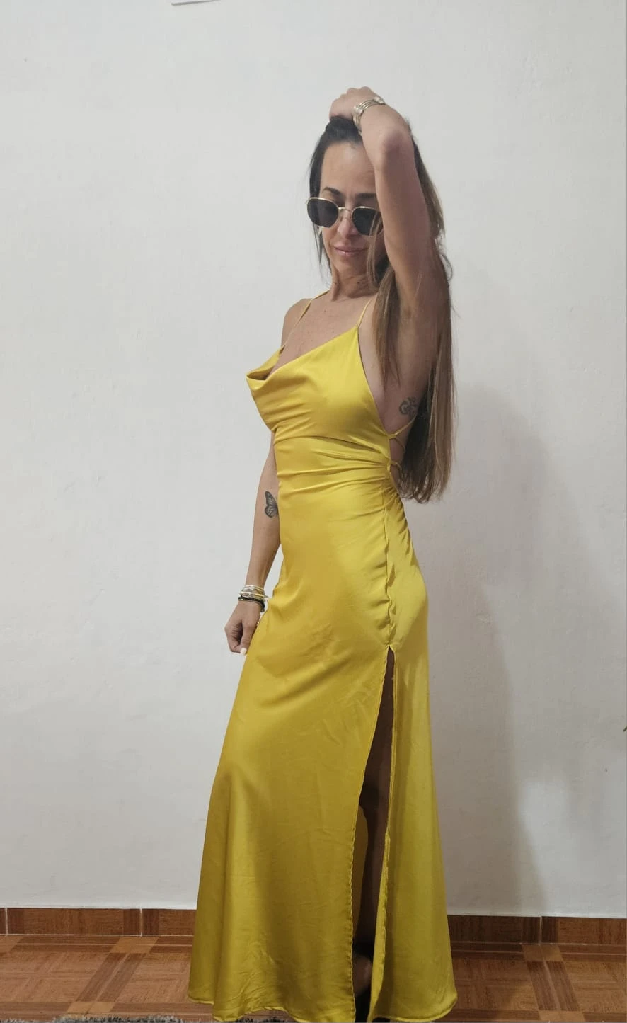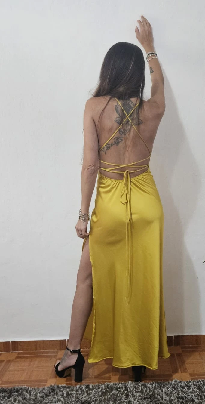 Vestido largo confeccionado en saten con tajo y escote volcado. Color amarillo.